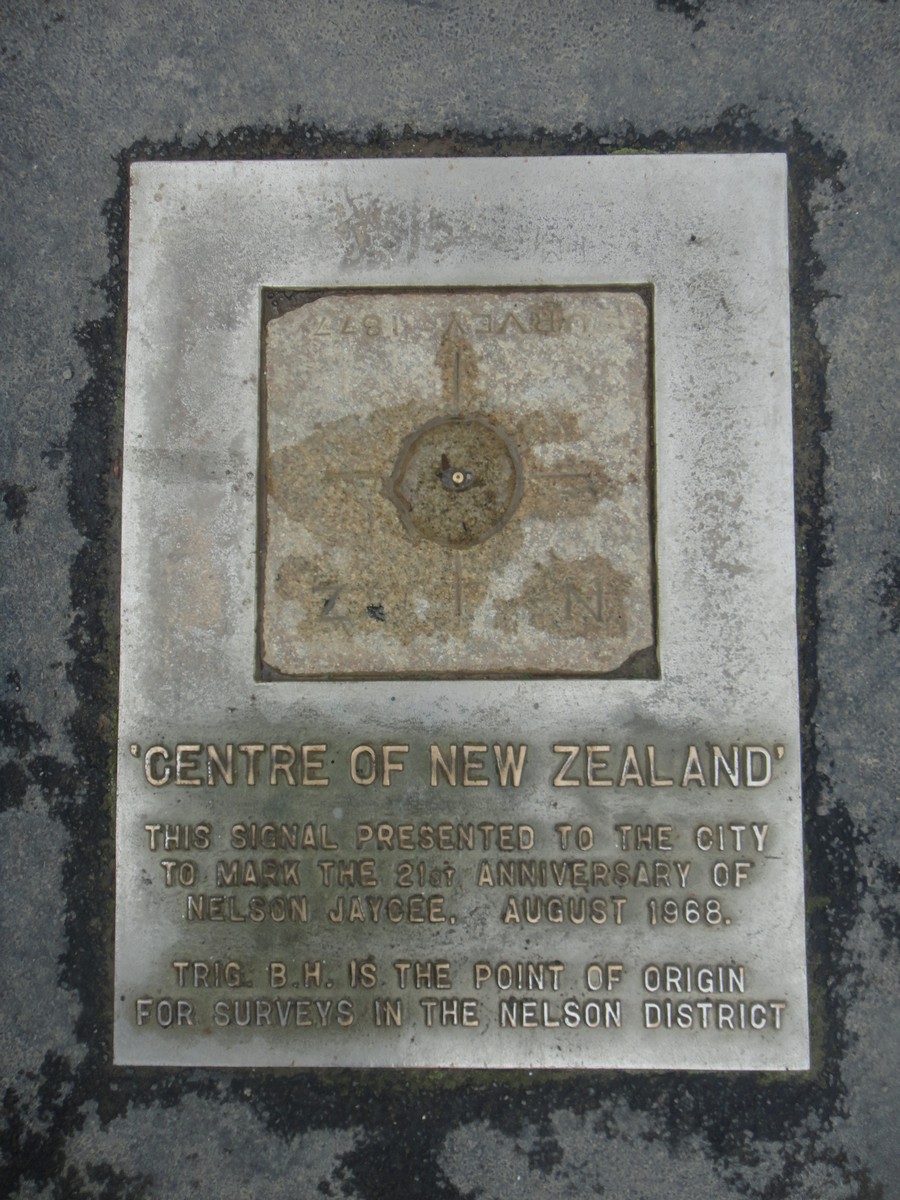 topo há um marco estipulando o ponto central da Nova Zelândia, há exatos 750km
